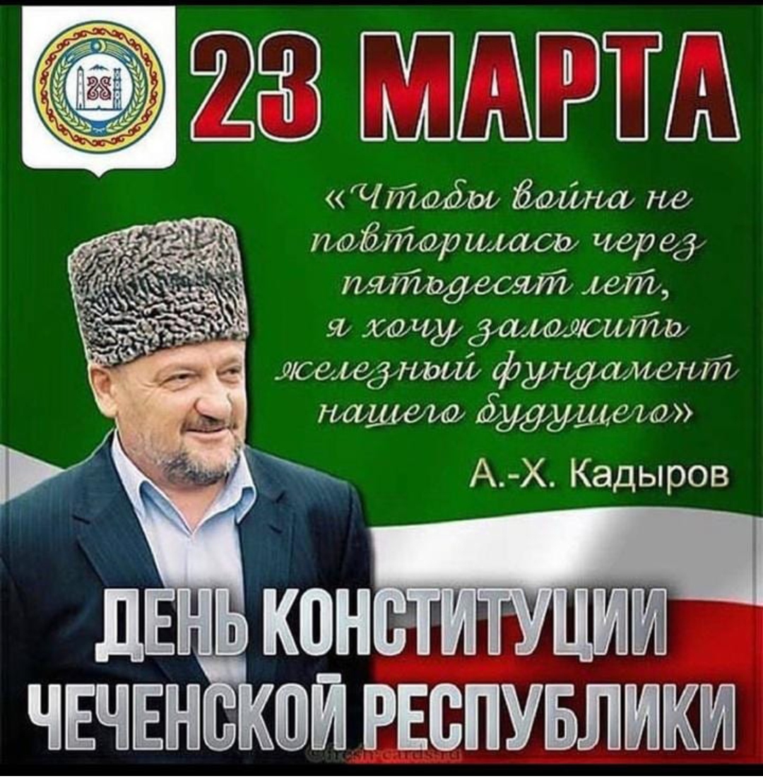 23.03.202123 марта 2003 года стал судьбоносным событием для Чеченского народа. День Конституции Чеченской Республики стал великим праздником для всего населения Республики и днём победы Ахмат-Хаджи Кадырова (Дала г1азот кьобал дойла цуьнан) , который всецело отдал себя интересам нашего народа, идее конституционного развития Чеченской Республики в составе Российской Федерации. Сегодня наша Республика превратилась в один из самых безопасных и процветающих уголков Российской Федерации. Но нельзя забывать, что все это достигнуто ценой жизни первого Президента Ахмат-Хаджи Кадырова, ценой жизни тысячи сотрудников правоохранительных органов Республики. Ахмат-Хаджи Кадыров подарил нашему народу огонь жизни и свет надежды на счастливую жизнь. Сегодня, в это непростое время, всем нам нужно сплотиться вокруг нашего Главы ЧР, Героя России, национального лидера - Рамзана Ахматовича Кадырова, и не дать нашим недругам вновь втянуть нас в хаос и беззаконие. Мы должны всеми силами беречь наше единство и мир, которые основываются на прочном фундаменте – Конституции Чеченской Республики.