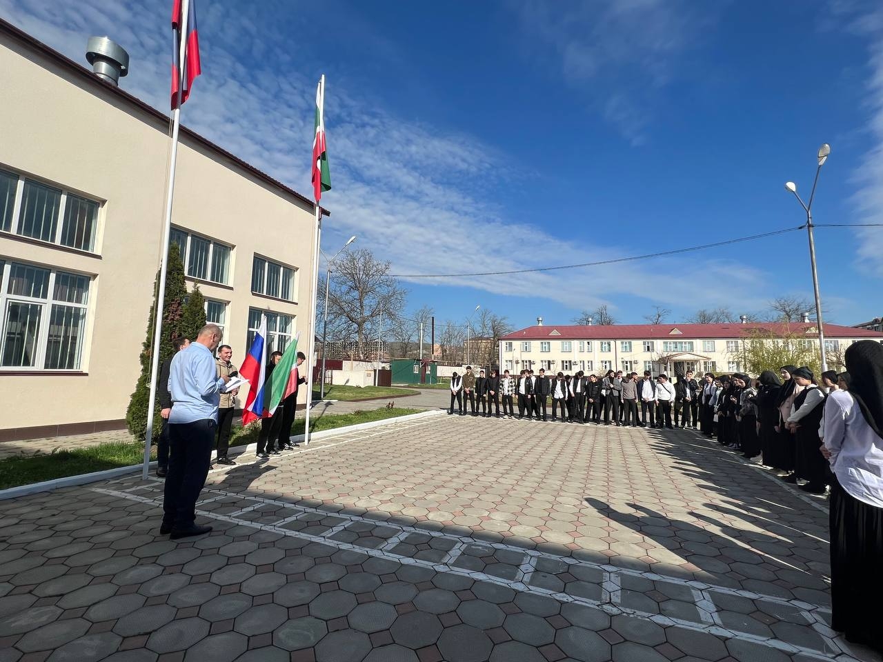 Учебная неделя в Чеченском социально-правовом колледже, началась с торжественной церемонии поднятия Государственных Флагов, исполнения Гимнов Российской Федерации и Чеченской Республики.