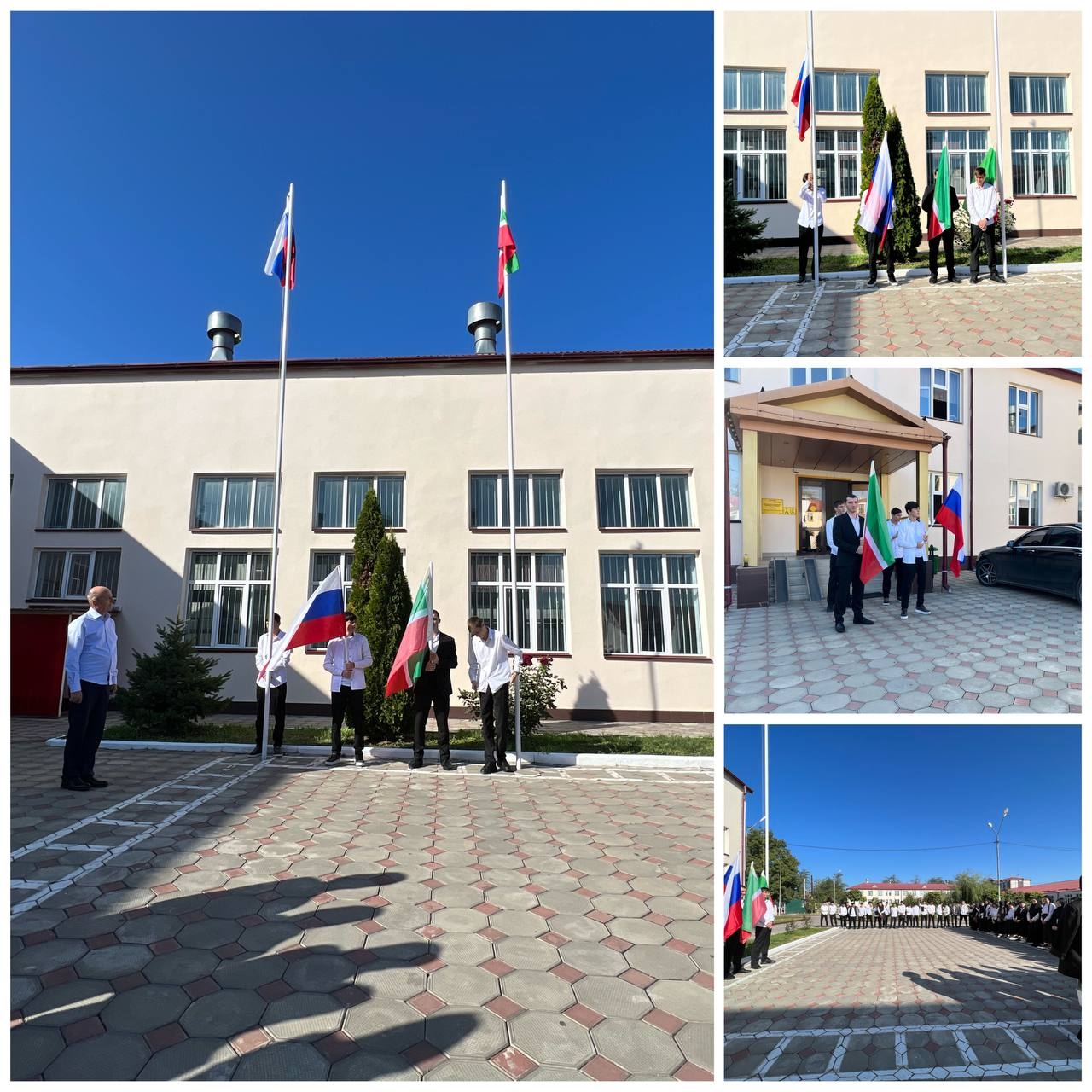 Поднятие флага прошло под Гимны РФ и ЧР, под руководством педагога ОБЖ и БЖ Юсупа Хайдаева.