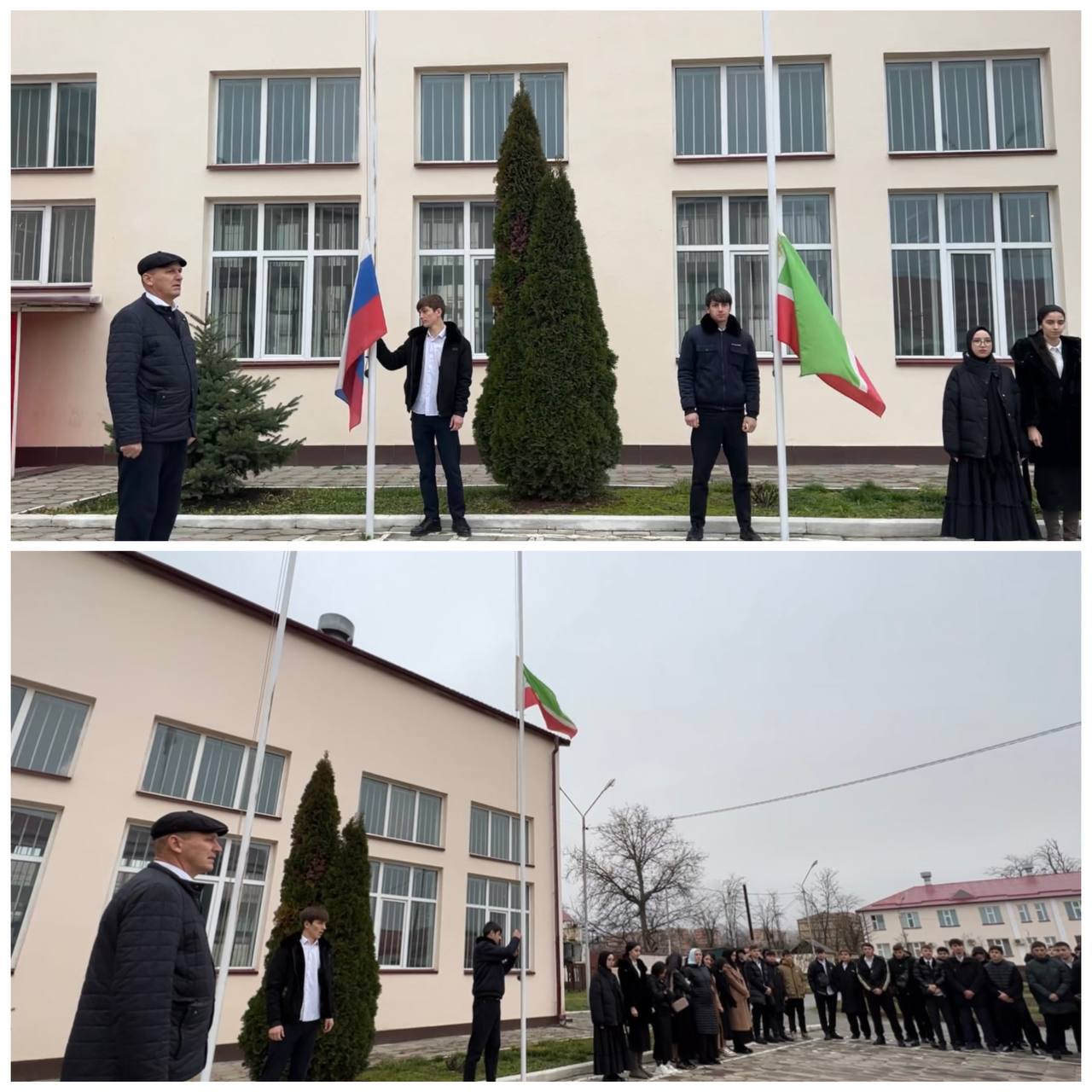 Поднятие флага прошло под Гимн РФ и ЧР, под руководством педагога ОБЖ и БЖ Юсупа Хайдаева.