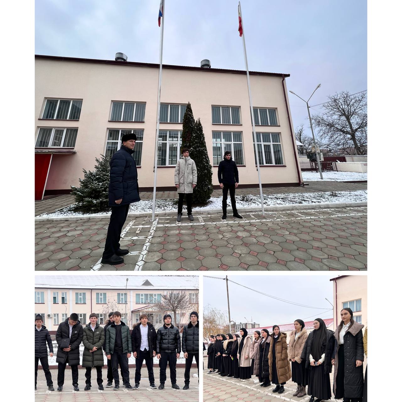 Поднятие флага прошло под Гимн РФ и ЧР, под руководством педагога ОБЖ и БЖ Юсупа Хайдаева.