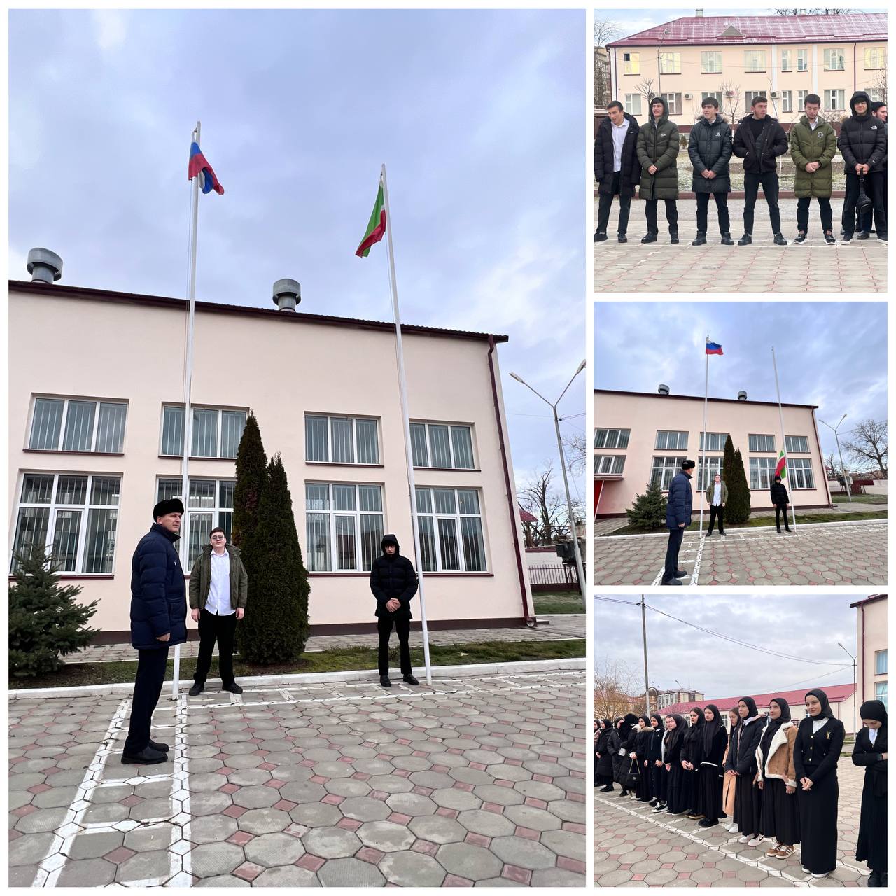 колледже началась с торжественной церемонии поднятия флагов и исполнения гимнов Российской Федерации и Чеченской Республики.