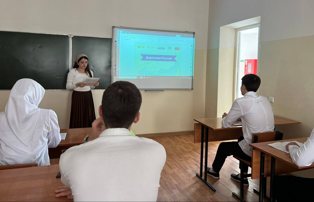 Традиционно, после церемонии поднятия флагов и звучания гимнов Российской Федерации и Чеченской республики, кураторы со студентами разошлись по кабинетам для проведения мероприятий из цикла «Разговоры о важном». Тема сегодняшних разговоров о важном - «Дорогами России».
