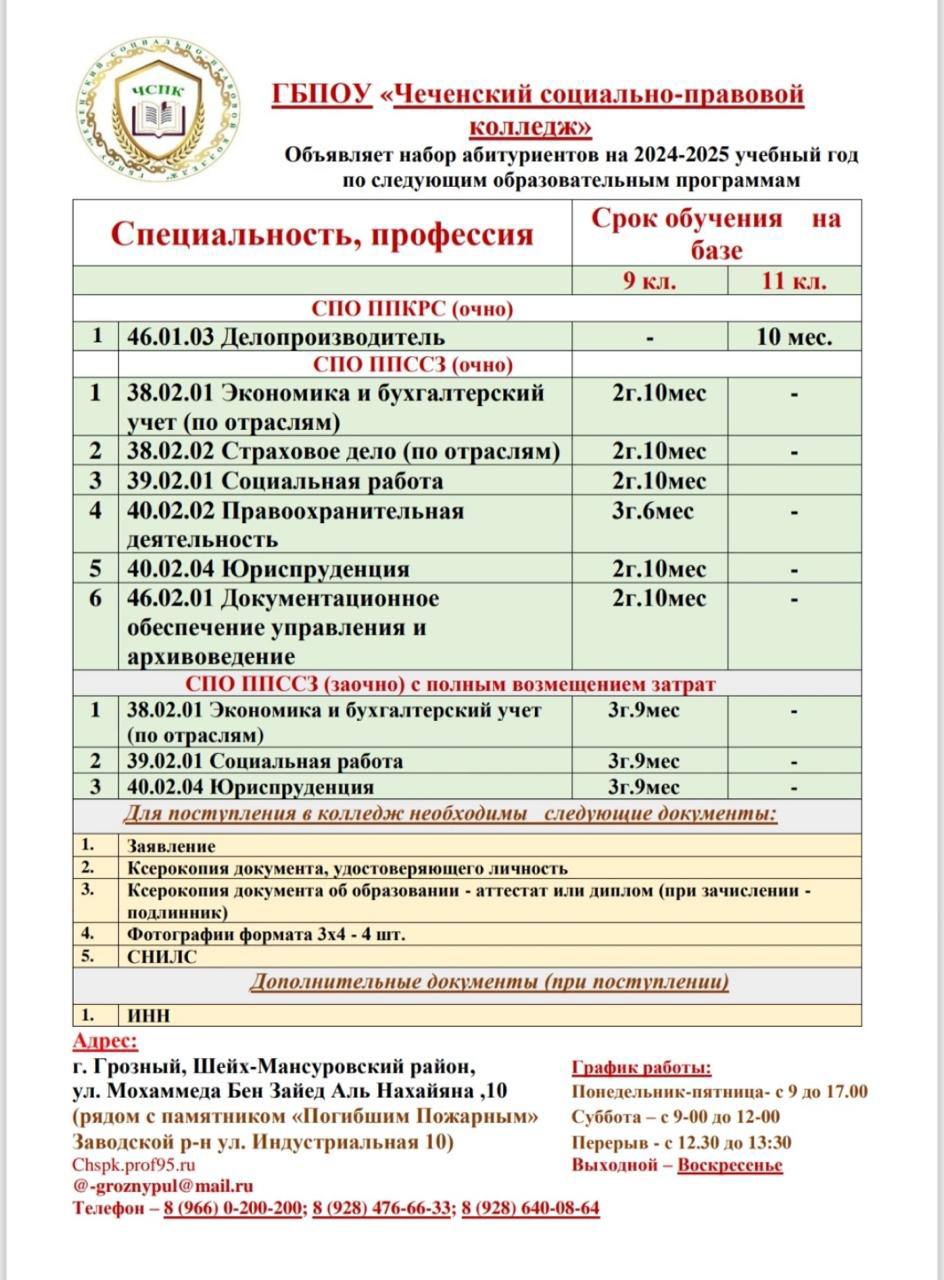 ГБПОУ «Чеченский социально-правовой колледж» предоставляет абитуриентам возможность стать частью студенческого братства, и освоить новые специальности и профессии.