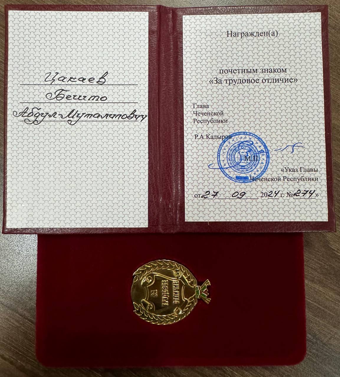 Сегодня,4 октября, в Министерстве образования и науки Чеченской Республики, прошла торжественная церемония награждения работников системы образования, удостоенных высоких государственных наград Российской Федерации и Чеченской Республики. Мероприятие, приуроченное ко Дню учителя, было посвящено признанию заслуг педагогов, которые внесли значительный вклад в развитие образования и воспитание молодого поколения. Директор Чеченского социально-правового колледжа, Цакаев Бешто Абдул-Муталипович, был награжден почетным знаком «За трудовое отличие» .