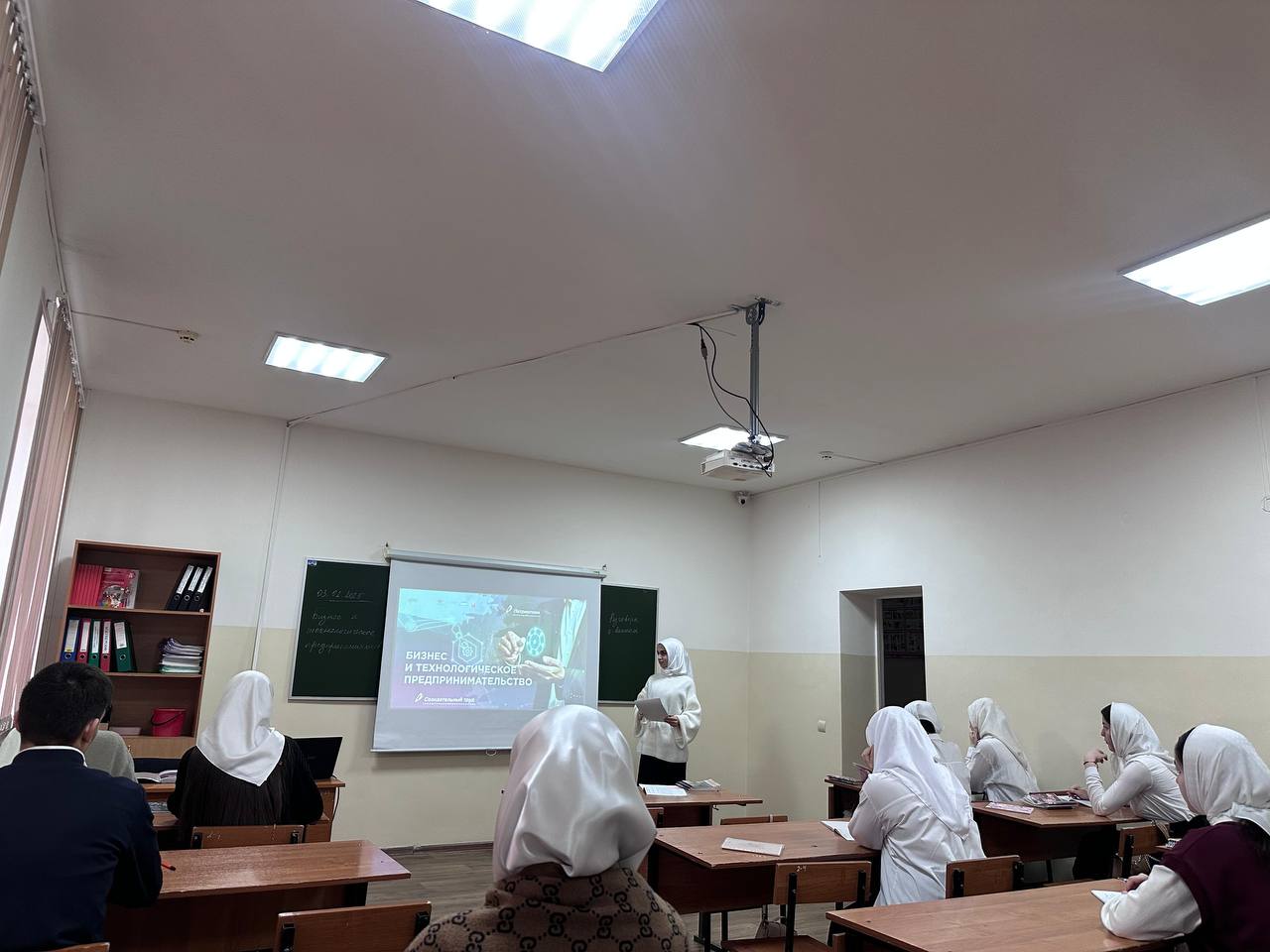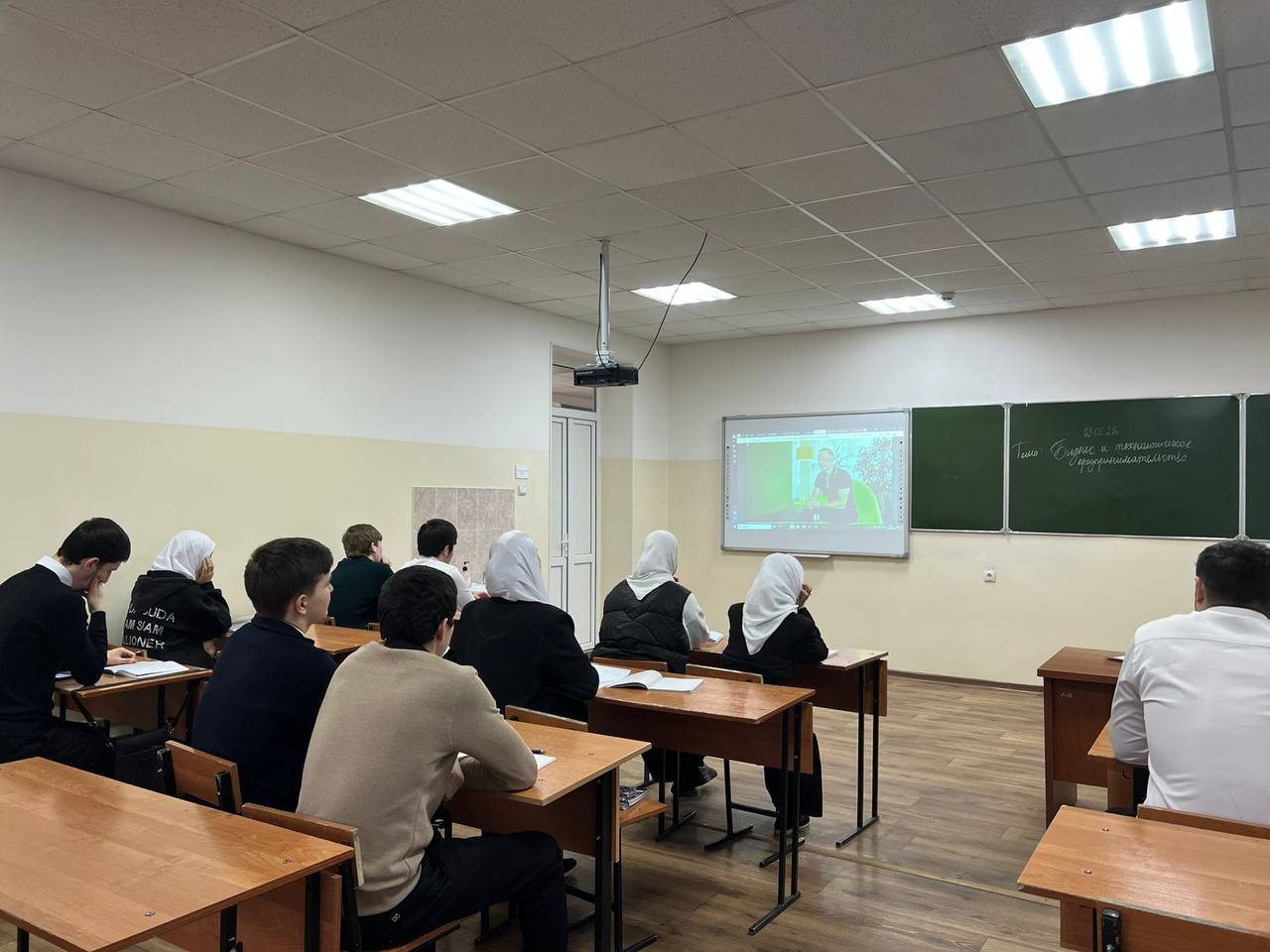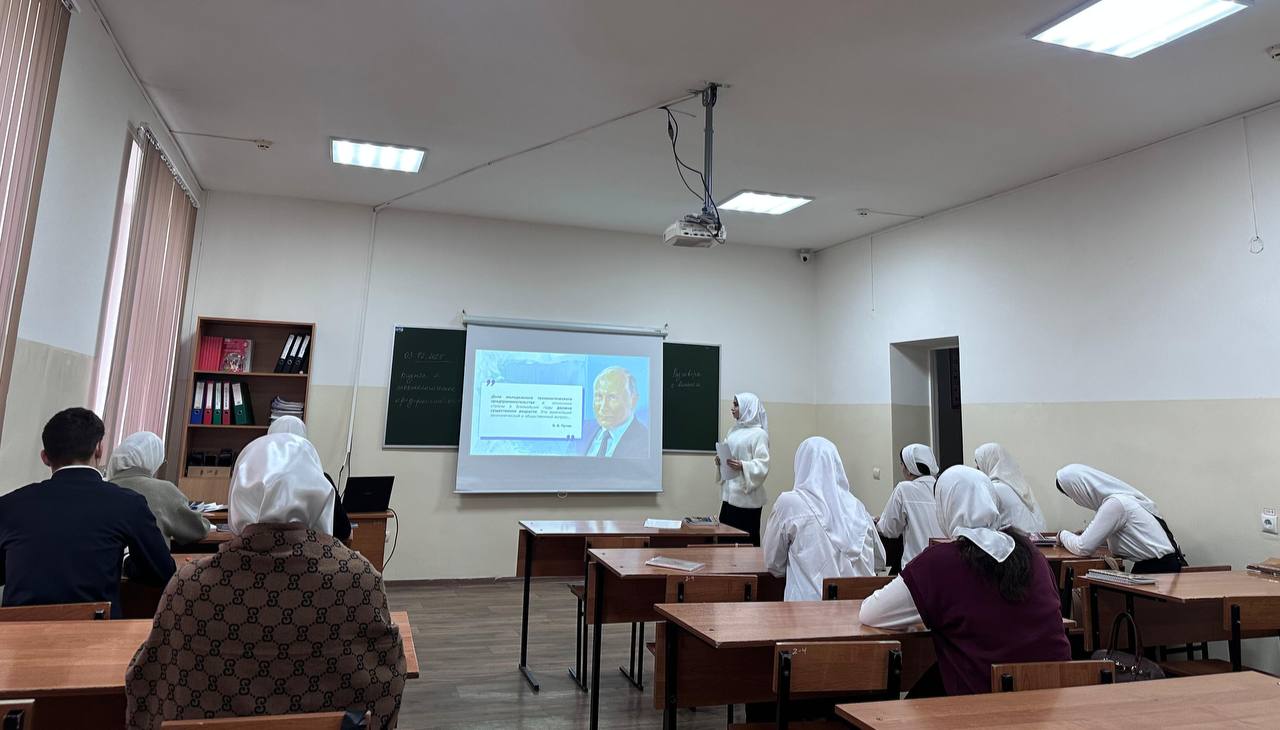 Традиционно, после церемонии поднятия флагов и звучания гимнов Российской Федерации и Чеченской республики, кураторы со студентами разошлись по кабинетам для проведения мероприятий из цикла «Разговоры о важном». Тема разговоров о важном - «Бизнес и технологическое