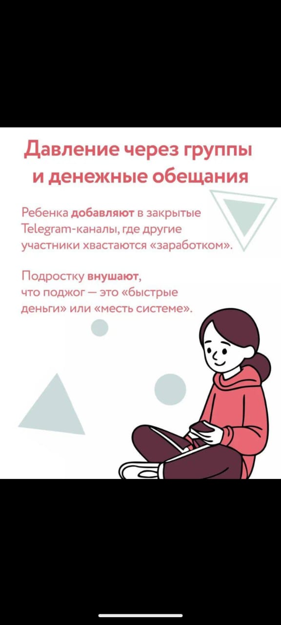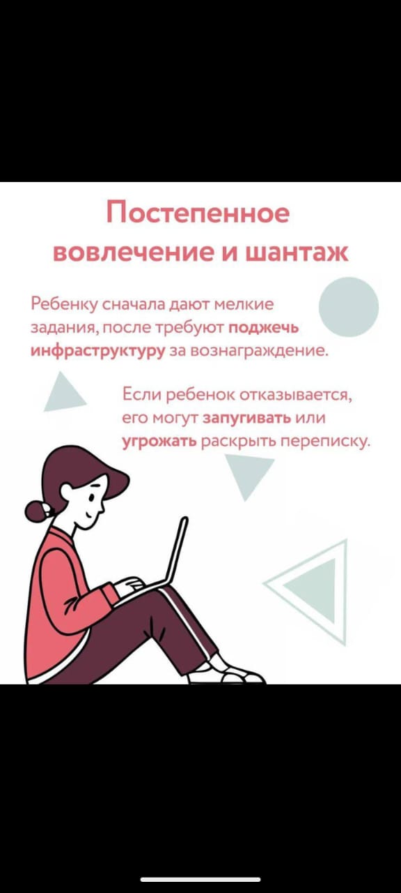 16.05.2025Украинские спецслужбы вербуют подростков (15-18 лет) для совершения диверсий в РФ за денежное вознаграждение. Целевая аудитория: подростки из неблагополучных семей, учащиеся школ и колледжей, активные пользователи соцсетей, не осознающие последствий.