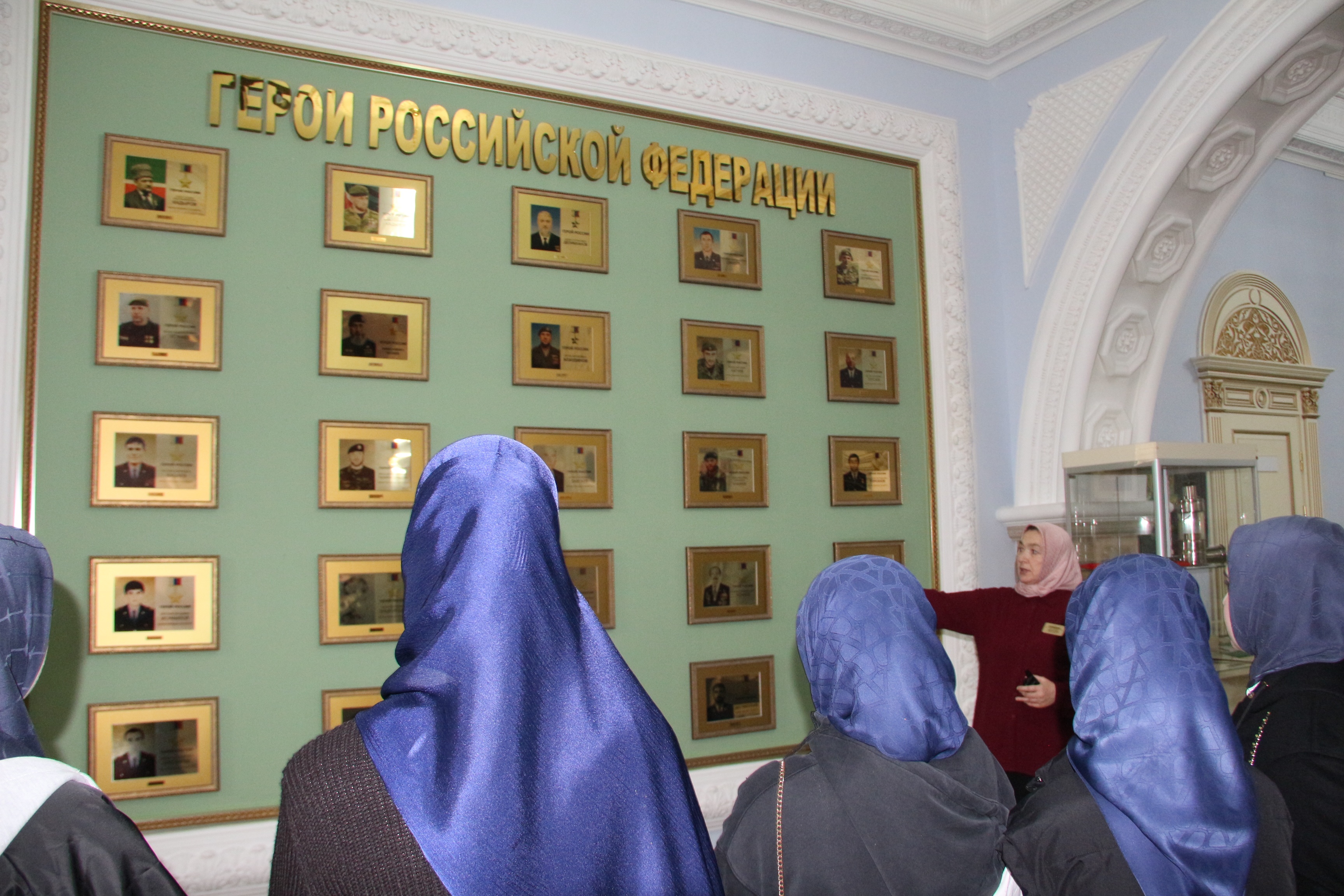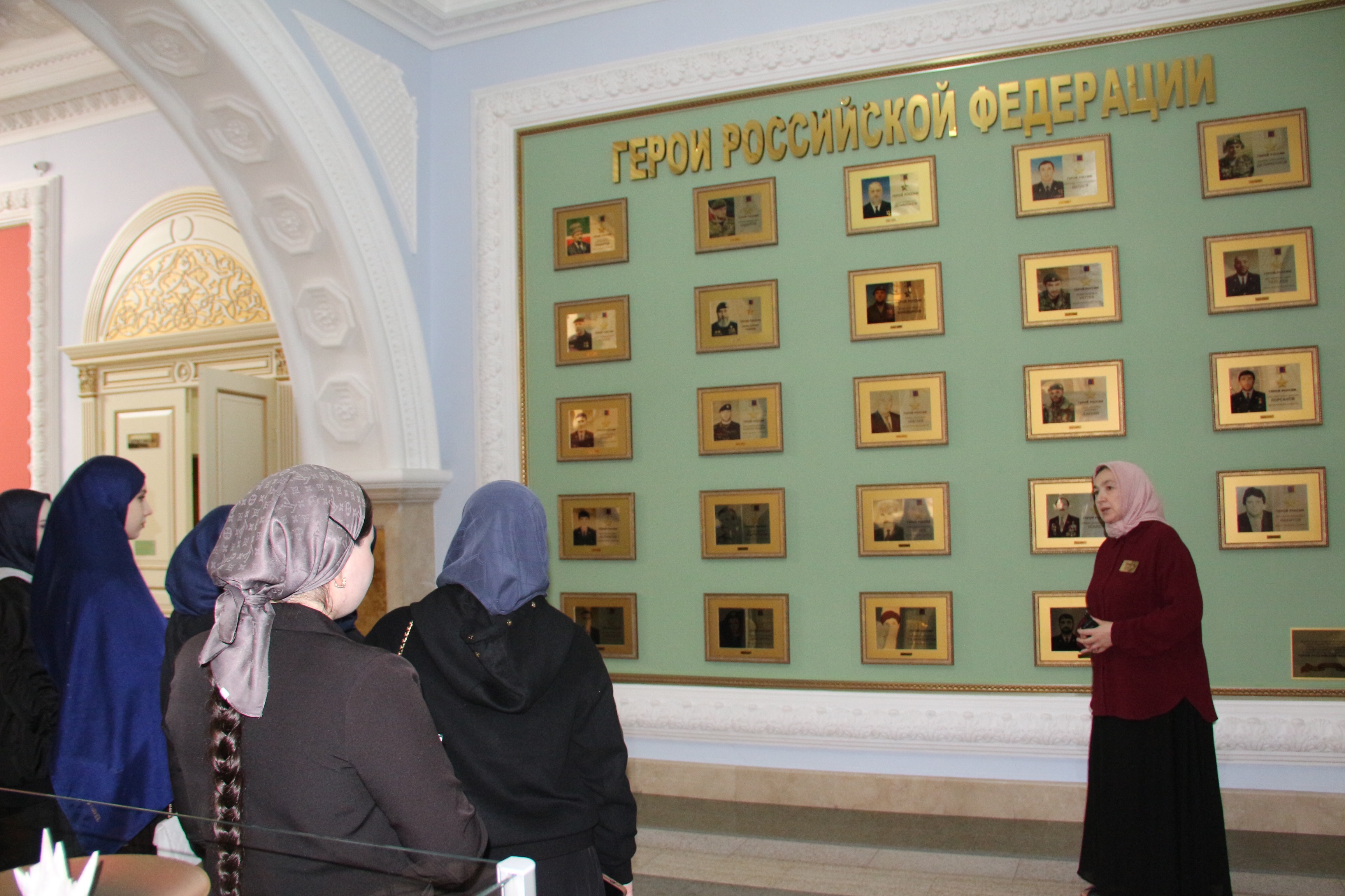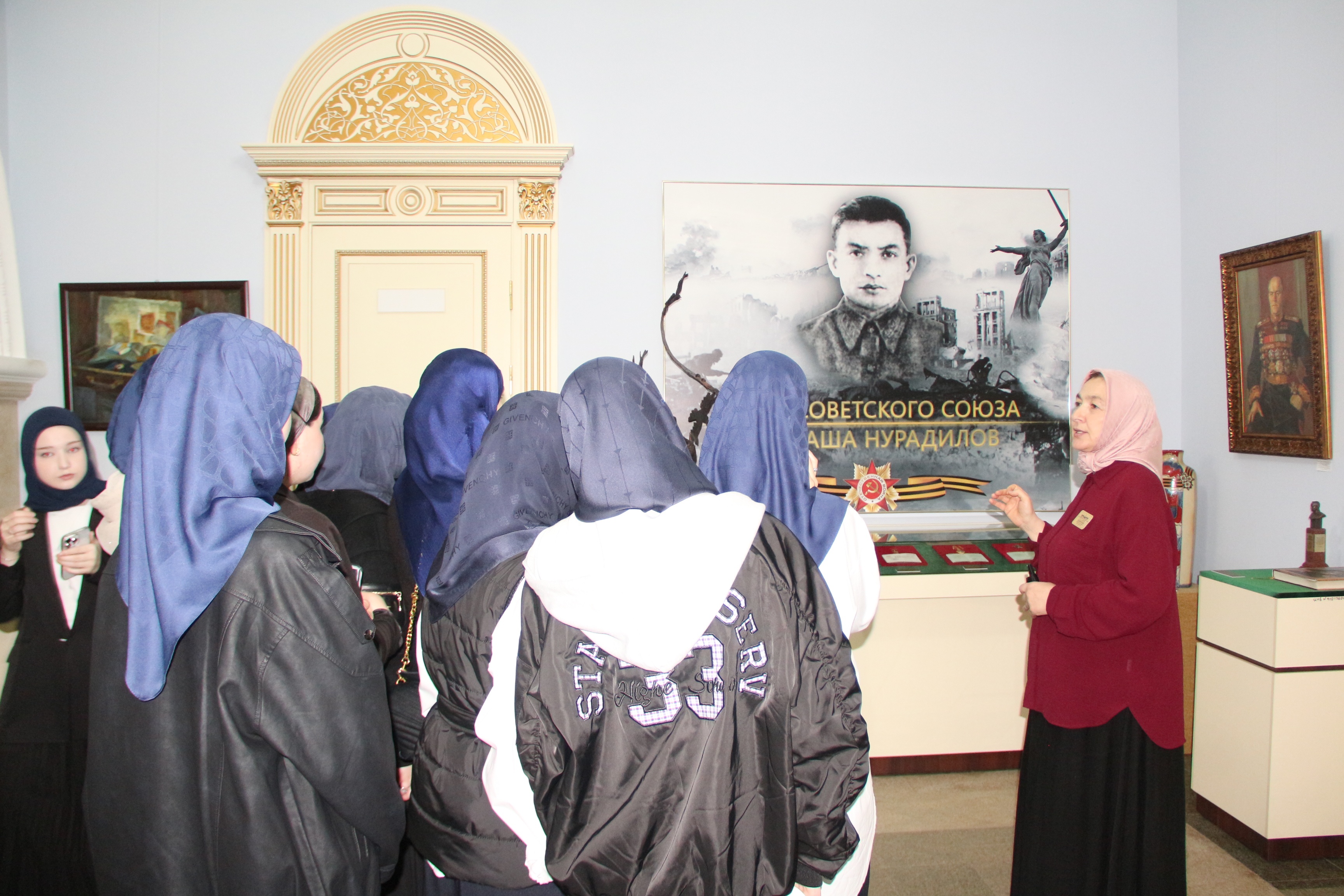Основной интерес студентов привлекла тема Великой Отечественной войны. Под руководством сотрудницы музея, студенты рассмотрели барельефы с изображением Героев СССР уроженцев Чечено-Ингушетии, барельефы с изображением эпизодов Великой Отечественной войны, Памятник Маташу Мазаеву и танкистам Великой Отечественной войны и другие экспонаты.